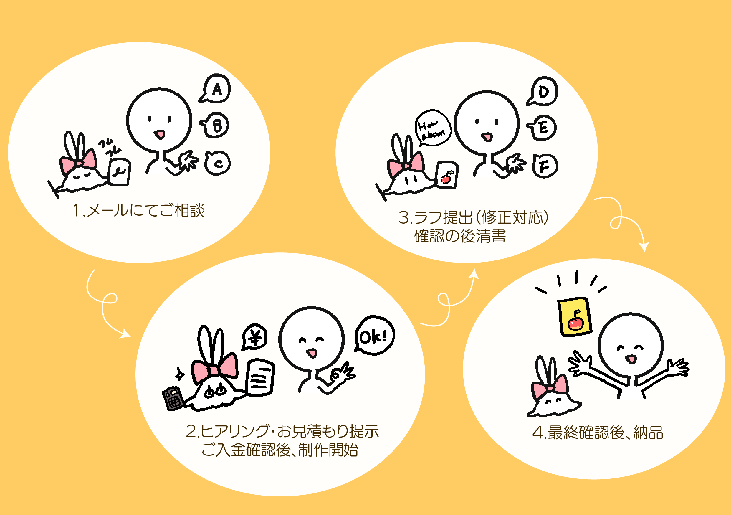 - 内容のヒアリング・お見積もり提示 ご入金確認後、制作開始